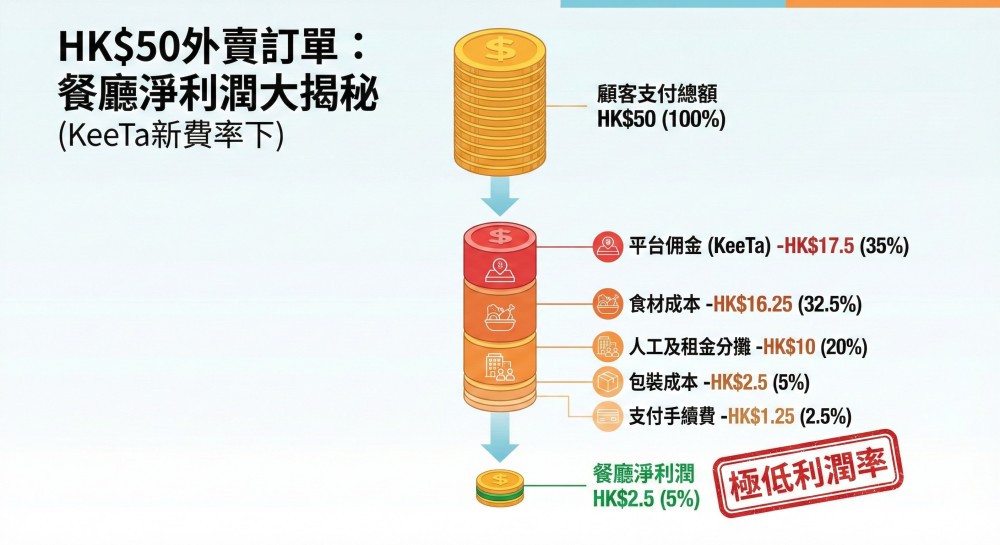 為直觀呈現平台佣金對餐廳利潤的侵蝕,以下模擬一份HK$50外賣訂單的成本結構: