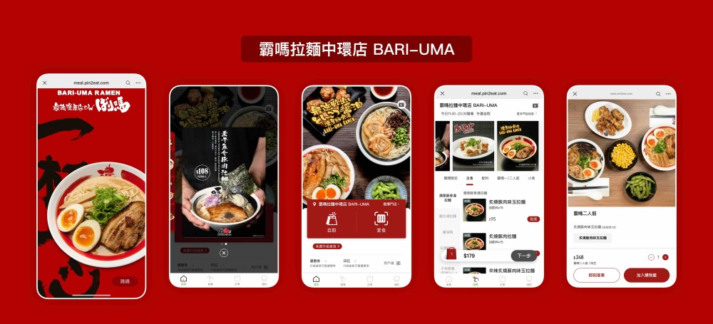 作為日式拉麵品牌,霸嗎拉麵最重要的是把「湯底與叉燒」的賣相在第一秒打進客人腦海。新 UI 手機點餐頁面一進入,就以全屏拉麵主視覺作開場,配合品牌紅色背景和日系字體,直接把堂食海報搬到手機上。BARI‑UMA 使用的重點功能與效果: